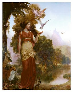 Now you turn in the other direction, toward the glorious color of the ripened fields and sun and you see a woman walking purposefully, gracefully, toward you. As she gets closer, you see how fully awake, how vibrant, and how joyful she is! She is glowing with health, radiating love, and her eyes are alive with intelligence. Her clothes are all the colors of the fields and she carries a large woven basket. Then you realize that there is a glowing, ethereal light around her head. You suddenly realize that here is the Goddess of the Harvest, Virgo the Virgin herself, and it is because of her that this bounty is before you.